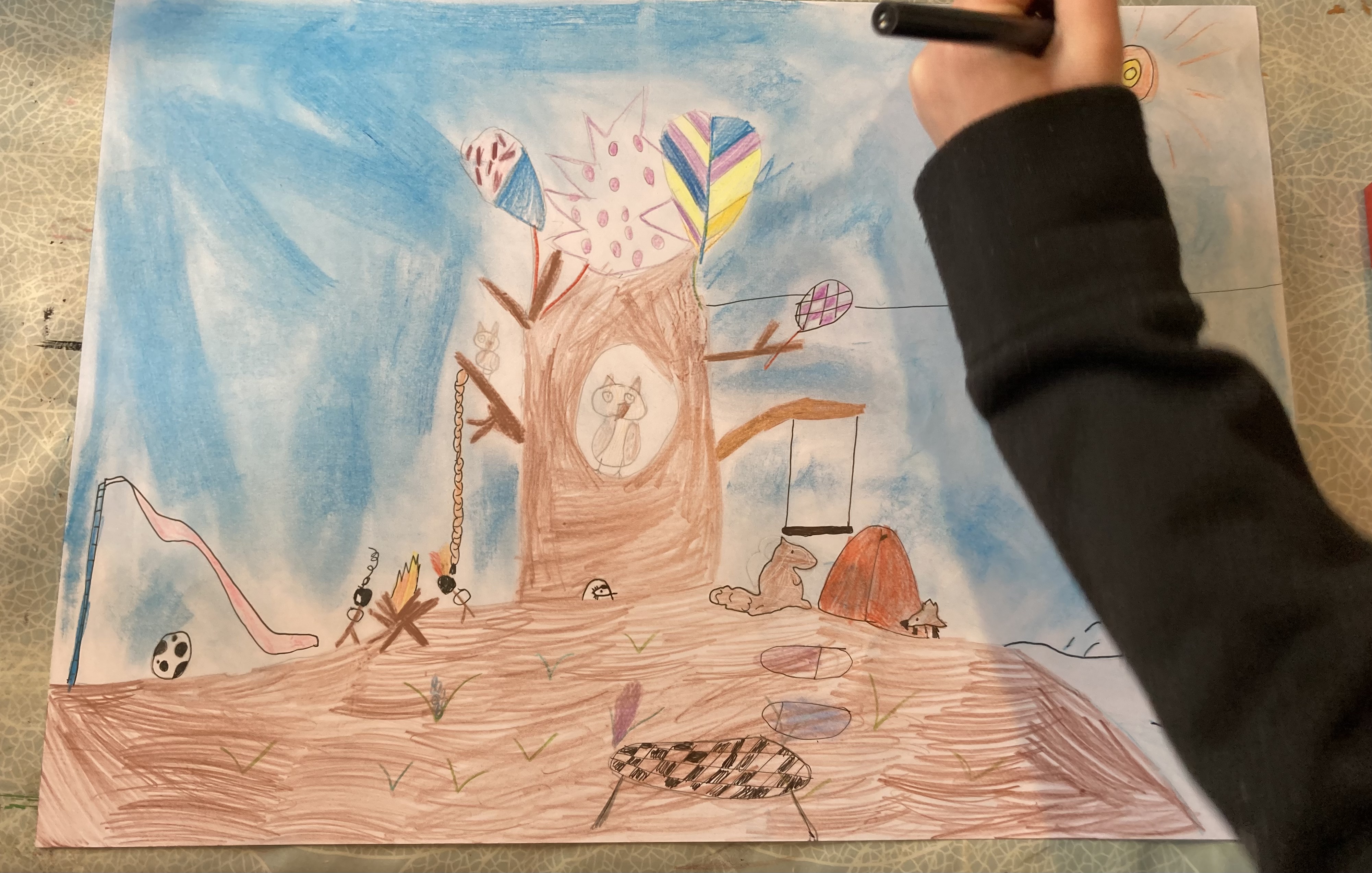 Ieder mens kan zich uiten op papier door beweging en kleur. Tekenen is spelen en spreken op papier. We tekenen omdat we onze expressie en creativiteit vorm willen geven. We drukken ons gevoel ermee uit.